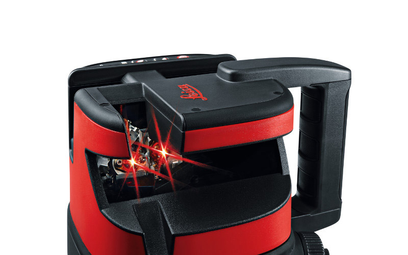 Korslaser som slår 180 grader horisontal och har 3 vertikala linjer samt lodpunkt neråt